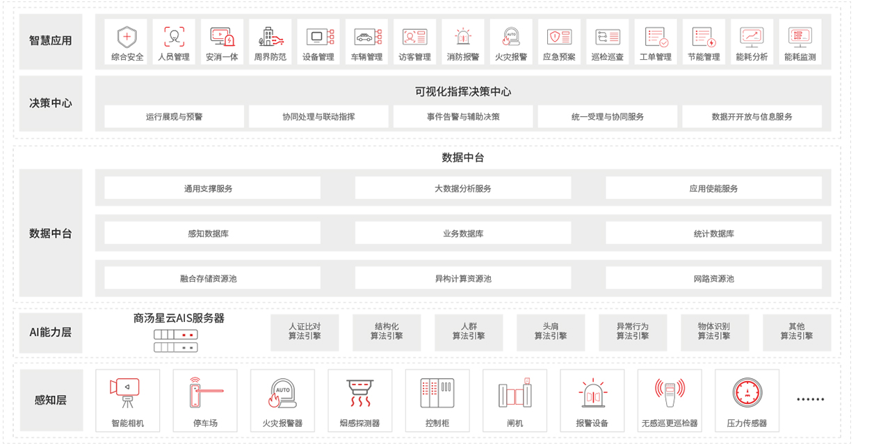 以物联网、可视化、云计算、大数据等现代信息技术为基础,通过感知化、互联化、智能化、平台化、一体化的手段,从安全、消防、能耗、停车四个方面建成基础设施高端、管理服务高效、创新环境高质、可持续发展的园区。